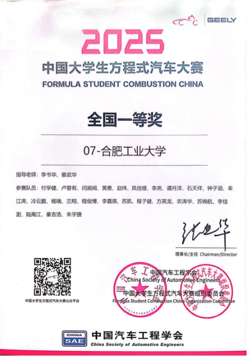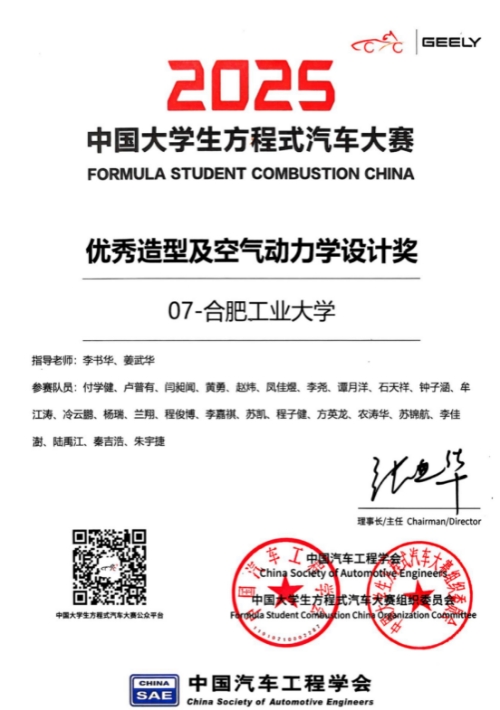 10月12日,经过多轮角逐,“2025中国大学生方程式汽车大赛(FSCC)”在郑州落下帷幕,合肥工业大学越影车队的“越影XVI赛车”凭借其卓越的整车性能和稳定的赛场发挥再次荣获全国一等奖。“越影XVI赛车”在造型与空气动力学设计等方面的前沿探索得到评委一致好评,被评为本届大赛“优秀造型和空气动力学设计奖”。