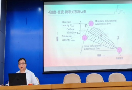 在讲解交通流理论时,荣教授结合自身研究经验,深入分析了交通流特征及速度—密度—流率关系。指出常见的道路限速值的确定核心在于实现“速度和谐”。同时介绍了交通流状态中的“离峰”和“尖峰”特征,强调应重视不同交通时段的运行特征,并从车辆时空轨迹图中解读出更多的交通状态信息。