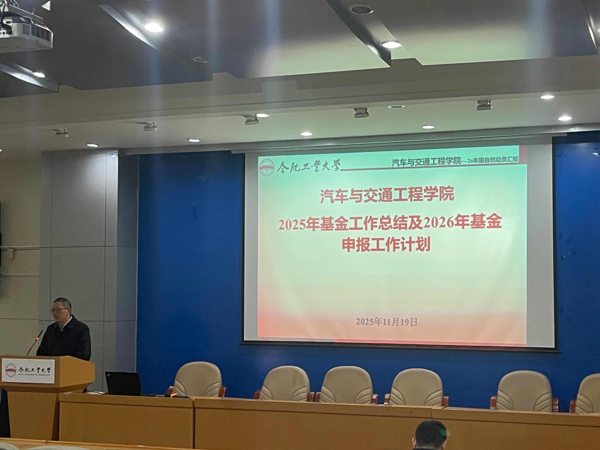 11月19日下午,汽车与交通工程学院在屯溪路校区格物楼214报告厅召开2026年国家自然科学基金申报动员会,旨在提高申报书撰写质量,动员全院教师积极参与。会议特邀西安交通大学汤成龙教授、福州大学吴鹏教授作专题辅导报告。学院龙建成院长主持会议,副院长钱叶剑以及学院拟申报教师参加会议。