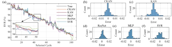 团队首先对实车充电数据进行了系统调研与统计分析,确定了适用于实际场景下特征提取的电压区间。在此基础上,构建了覆盖电池组和单体层面的多层次特征集,并采用多元统计方法对单体特征进行整合,以兼顾特征表达能力与模型输入一致性。该特征融合策略有效提升了在单体性能不一致场景下的评估稳健性与精度。最后,对Kolmogorov–Arnold网络(KAN)进行改进,采用切比雪夫多项式替代原激活函数,构建了切比雪夫Kolmogorov–Arnold网络(CKAN),并基于该网络搭建了高效、准确的残值评估模型。实验结果表明,所提出方法在电池不同老化阶段均可实现稳定的残值评估,与现有方法相比,在准确性与实际适用性方面均表现出显著优势。