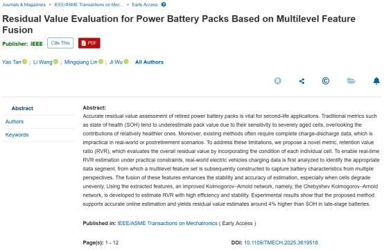 近日,我院新能源动力系统智能管理与控制团队在动力电池组残值评估研究领域取得新进展。相关成果“Residual Value Evaluation for Power Battery Packs Based on Multi-Level Feature Fusion”在机械工程领域Top期刊《IEEE/ASME Transactions on Mechatronics》上发表。