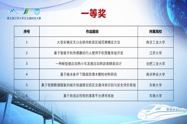 本次大赛以“绿色安全智慧 协同创新发展”为主题,初期共有23所设有交通运输类专业的高校本科生提交的作品94件,前期经过双向匿名评审,最终60件作品进入决赛。11月7日,经过一整天的激烈角逐,共评出一等奖6项,二等奖18项,三等奖24项,优秀奖12项。其中汽车与交通工程学院参赛作品《一种新型感应加热小车及感应加热沥青路面设计》(指导:刘凯;设计:罗一、渠志荣、刘欣欣、童子成、阮仁杰)荣获一等奖。