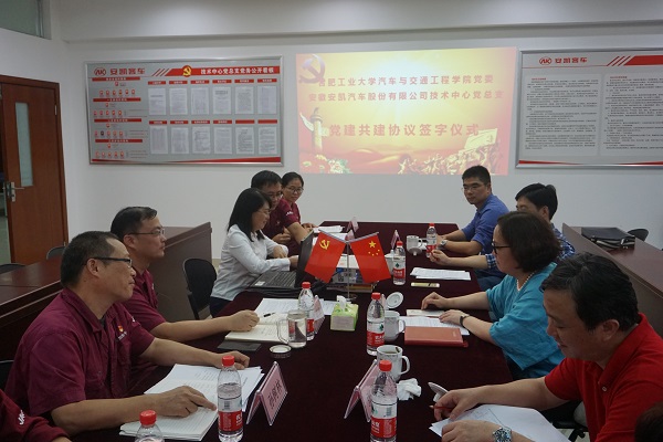 为深入学习贯彻党的十九大精神,探索在新时代下高校基层党建工作新思路,创新校企产学研合作发展新模式,10月8日下午,汽车与交通工程学院党委书记石琴等一行5人赴与安徽安凯汽车股份有限公司开展基层党支部共建活动。安凯汽车股份有限公司党委委员、技术中心党总支书记陈顺东等6人参加了会议。会议由汽车与交通工程学院党委委员姜武华老师主持。