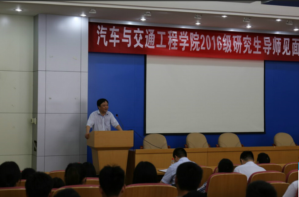 2016年8月24日上午8点,汽车与交通工程学院2016级研究生导师见面会于格物楼214报告厅举行。院长张代胜老师、院党委书记石琴老师,副院长钱立军、姜康老师以及各系主任出席了会议。会议由教学副院长卢剑伟主持,
