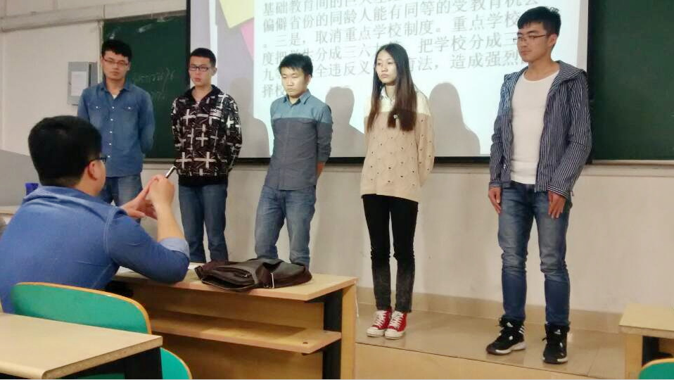参与此次答辩的积极分子分为4个小组,每个组对于中国时事各自进行了一场精彩绝伦的答辩。第一组代表于得水同学对今年反腐题材讲述了自己组的看法。他先从羊年春晚反腐小品引入主题,接着列举了2014反腐大事记,从根源上分析腐败的原因,最后联系自身,讲述我们入党积极分子应该怎么做。PPT讲解完后,全组成员一起上台接受梁老师的提问。有条不紊,分工明确的表现让第一组获得9.1的高分。之后的三个小组就各自的主题——“英语可能退出高考”、“两会中食品安全的责任保险”、“高等院校教育资源在各省分配存在极大不均”进行了激烈的答辩,表达了自己的看法以及给出了合理恰当的建议,最后也取得不俗的成绩。