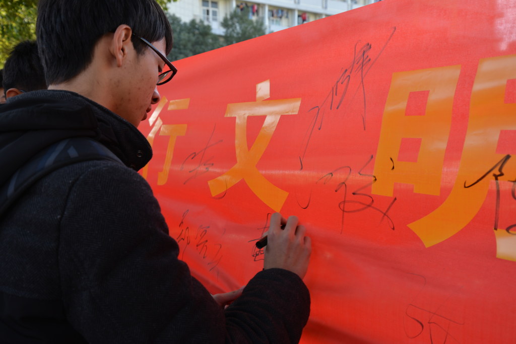 张卫华老师首先从交通安全宣传发展的历史、意义以及重要性三方面发表讲话,让同学们切实地认识到交通安全与我们的生活息息相关,必须加强交通安全观念;并举出其一名学生因酒驾而失去宝贵生命的例子,告诫大家“事故发生只在一秒,千万不要有侥幸心理”。随后,合肥市交警支队张警官通过“平均200个家庭就会有一人发生交通事故”等几组数据向同学们说明了重视交通安全的紧迫性,并告诫“低头族”切记交通安全;同时张警官也为大家讲解了冬季安全需要注意的几个方面,并希望通过大学生这只“小手”来带动更多人乃至整个社会这个“大手”的交通安全意识。接着,心理协会的相关人员宣读“安全交通,文明出行”誓词,表明当代大学生的立场。最后进入交通知识问答和签名环节,现场气氛高涨,同学们激情昂扬。