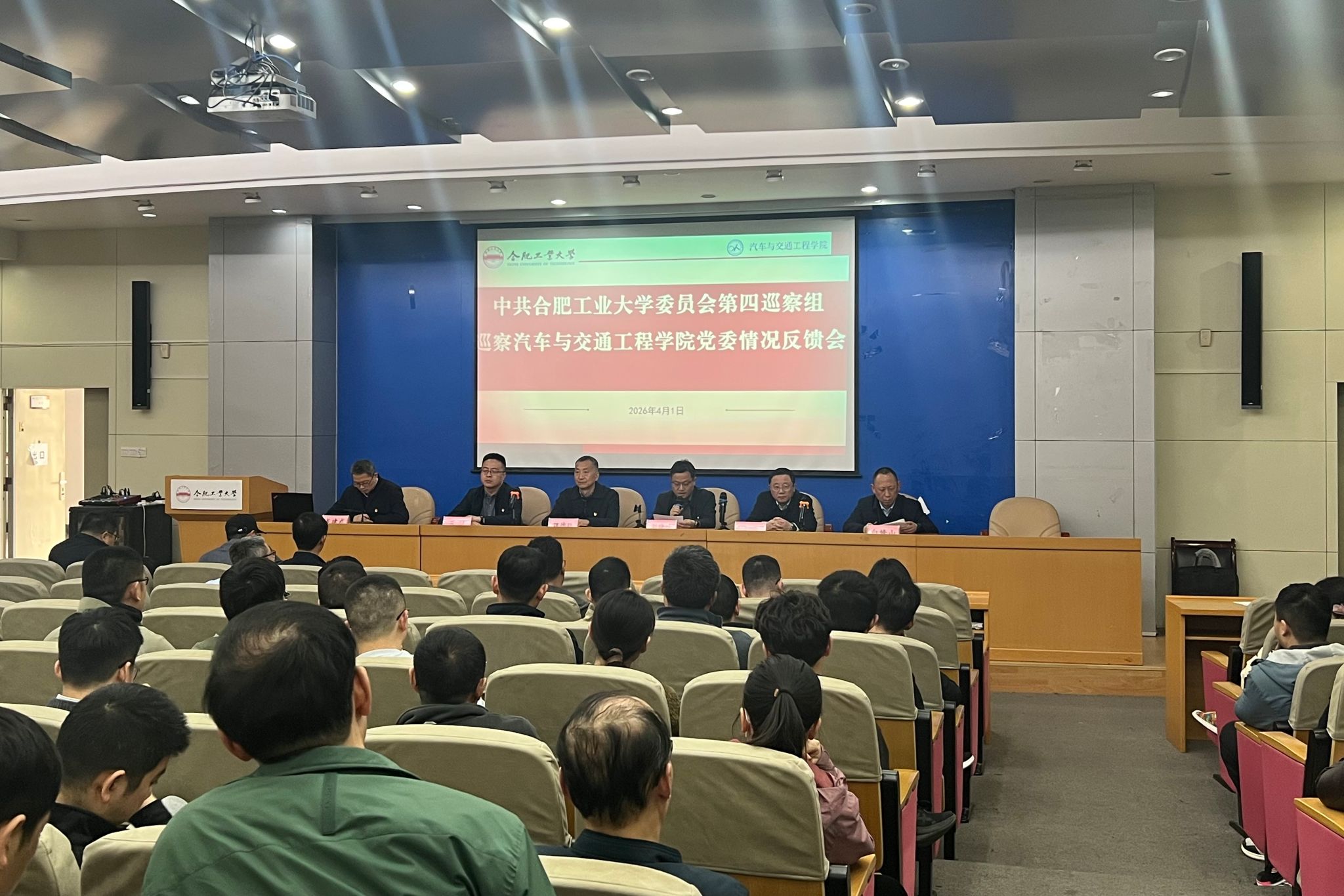 4月1日下午,中共合肥工业大学委员会第四巡察组巡察汽车与交通工程学院党委情况反馈会在格物楼214报告厅召开。党委巡察工作办公室副主任魏德胜、巡察组全体成员、学院全体教职工、学生代表参加会议。会议由院长龙建成主持。