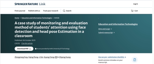 近日,我院冯忠祥教授团队在教育教学领域取得重要进展。相关研究成果“A case study of monitoring and evaluation method of students' attention using face detection and head pose estimation in a classroom”在教育教学领域国际知名期刊《Education and Information Technologies》(ISSN:1360-2357)在线发表(DOI:https://doi.org/10.1007/s10639-025-13771-7)。该期刊为教育教学技术领域的权威期刊,由国际信息处理联合会教育技术委员会(IFIP TC3)与联合国教科文组织合作创办,1996年由Springer出版社创刊。该刊聚焦信息通信技术与教育系统的复杂关系研究,内容涵盖微观层面的课堂技术应用案例与宏观层面的国家教育政策分析,研究范围贯穿学前教育至终身学习全阶段。期刊文章被SSCI收录,JCR“EDUCATION & EDUCATIONAL RESEARCH”分类位于Q1,2024年影响因子IF=5.4,近5年平均影响因子IF=5.7。