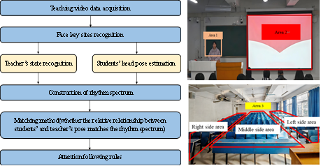 “A case study of monitoring and evaluation method of students' attention using face detection and head pose estimation in a classroom”论文提出了一种基于人脸检测与头部姿态估计(HPE)的课堂学生注意力监测与评估方法。该方法通过分析教师与学生的人脸与头部特征,结合人脸检测与头部姿态估计技术,构建节奏谱以实时匹配教师的教学节奏与学生的注意力状态,动态反映学生注意力变化情况。研究中利用摄像头采集授课教师与听课学生的视频数据,避免了对学生学习状态的侵入式干扰,同时进行人脸检测,识别视频每一帧的人脸关键点,并根据这些关键点的空间关系确定教师和学生的头部姿态。进而,基于教师期望学生注意力跟随区域分布构建节奏谱,以期指导学生在不同教学阶段应关注的区域,并评估学生的注意力水平。结果发现: 50分钟(一堂课时间)内学生听课注意力呈现明显波动性变化,其中课堂第5-20分钟为学生听课的“黄金时段”,第20-25分钟与课堂结束前5分钟为听课“低谷时段”。